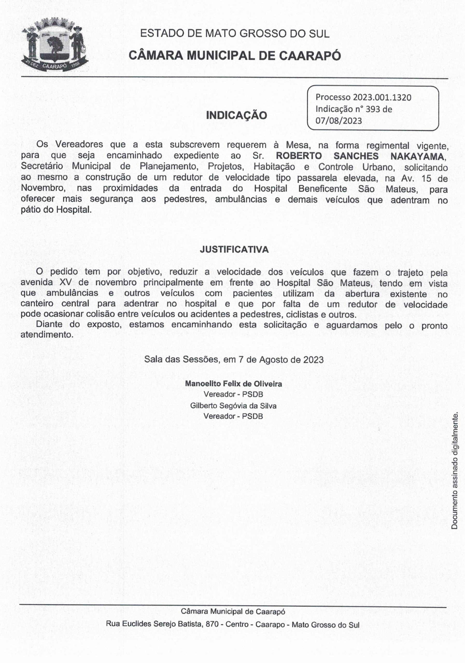 Indicação 393/2023, de autoria do Vereador MANOELITO FELIX DE OLIVEIRA e coautoria do Vereador GILBERTO SEGÓVIA DA SILVA solicitando ao Sr. ROBERTO SANCHES NAKAYAMA, Secretário Municipal de Planejamento, Projetos, Habitação e Controle Urbano, a construção de um redutor de velocidade tipo passarela elevada, na Av. 15 de Novembro, nas proximidades da entrada do Hospital Beneficente São Mateus, para oferecer mais segurança aos pedestres, ambulâncias e demais veículos que adentram no pátio do Hospital.