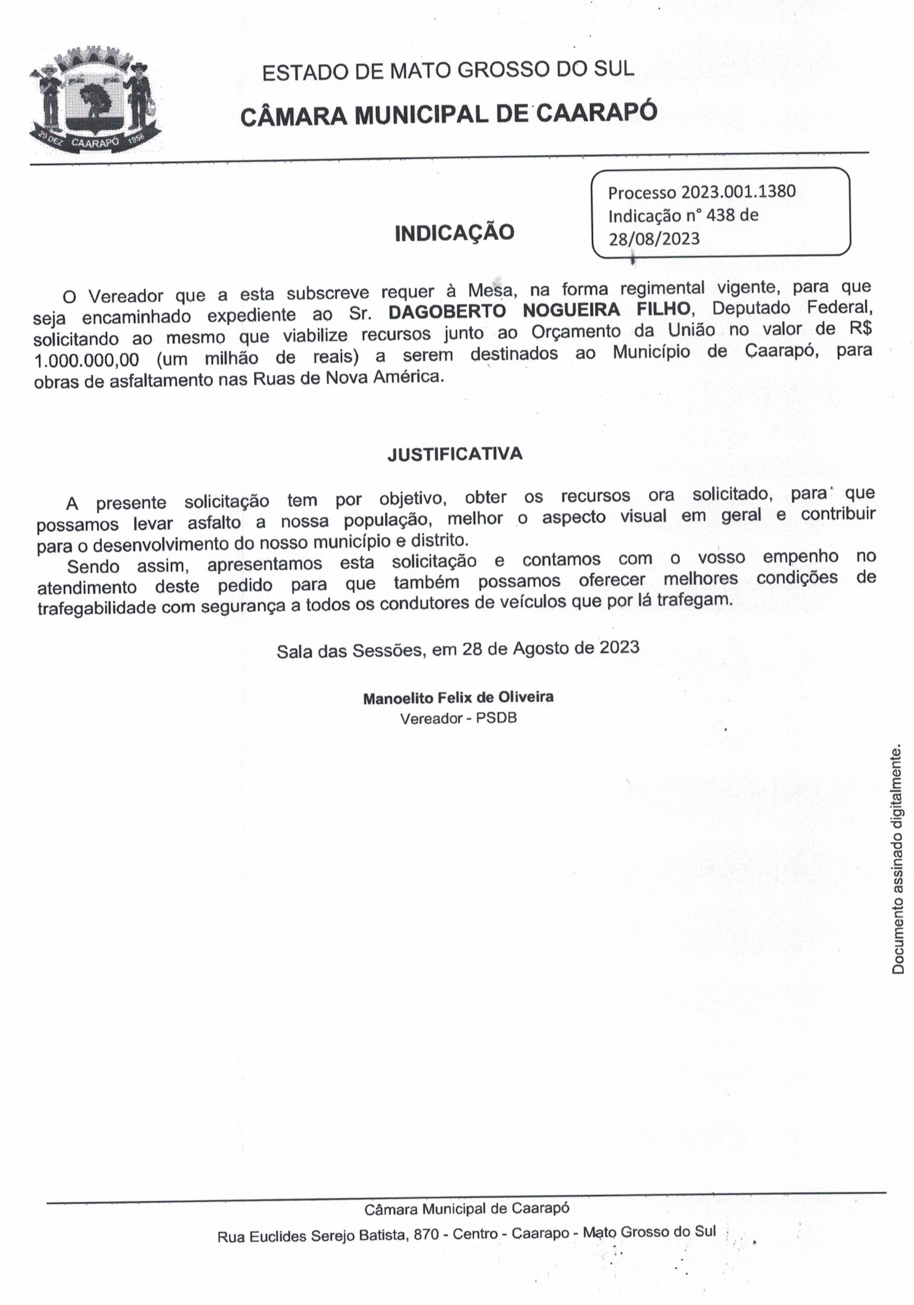 Indicação 438/2023, de autoria do Vereador MANOELITO FELIX DE OLIVEIRA solicitando ao Sr. DAGOBERTO NOGUEIRA FILHO, Deputado Federal, que viabilize recursos junto ao Orçamento da União no valor de R$ 1.000.000,00 (um milhão de reais) a serem destinados ao Município de Caarapó, para obras de asfaltamento nas Ruas de Nova América.