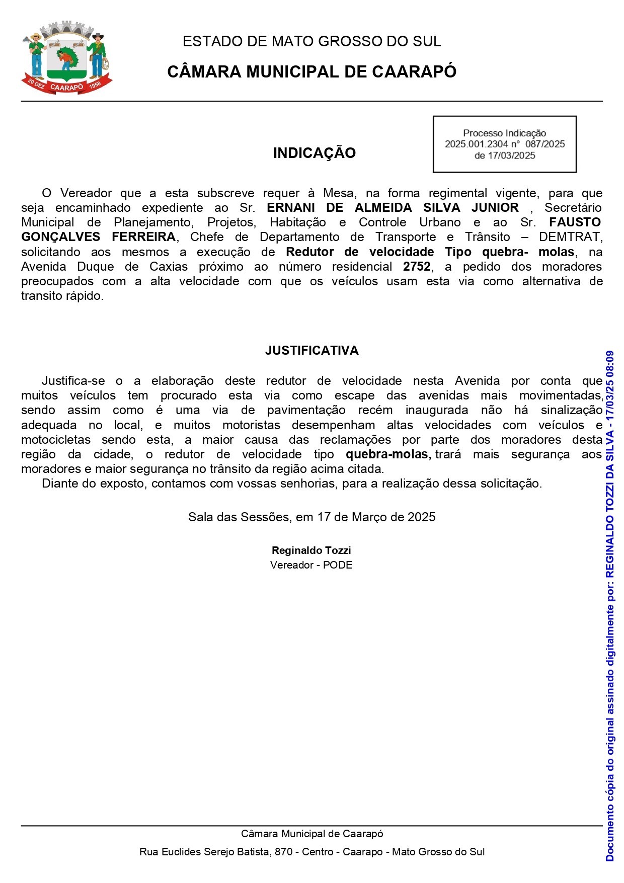 Indicação 087/2025, de autoria do Vereador REGINALDO TOZZI solicitando ao Sr. ERNANI DE ALMEIDA SILVA JUNIOR , Secretário Municipal de Planejamento, Projetos, Habitação e Controle Urbano e ao Sr. FAUSTO GONÇALVES FERREIRA, Chefe de Departamento de Transporte e Trânsito – DEMTRAT, a execução de Redutor de velocidade Tipo quebra- molas, na Avenida Duque de Caxias próximo ao número residencial 2752, a pedido dos moradores preocupados com a alta velocidade com que os veículos usam esta via como alternativa de transito rápido.