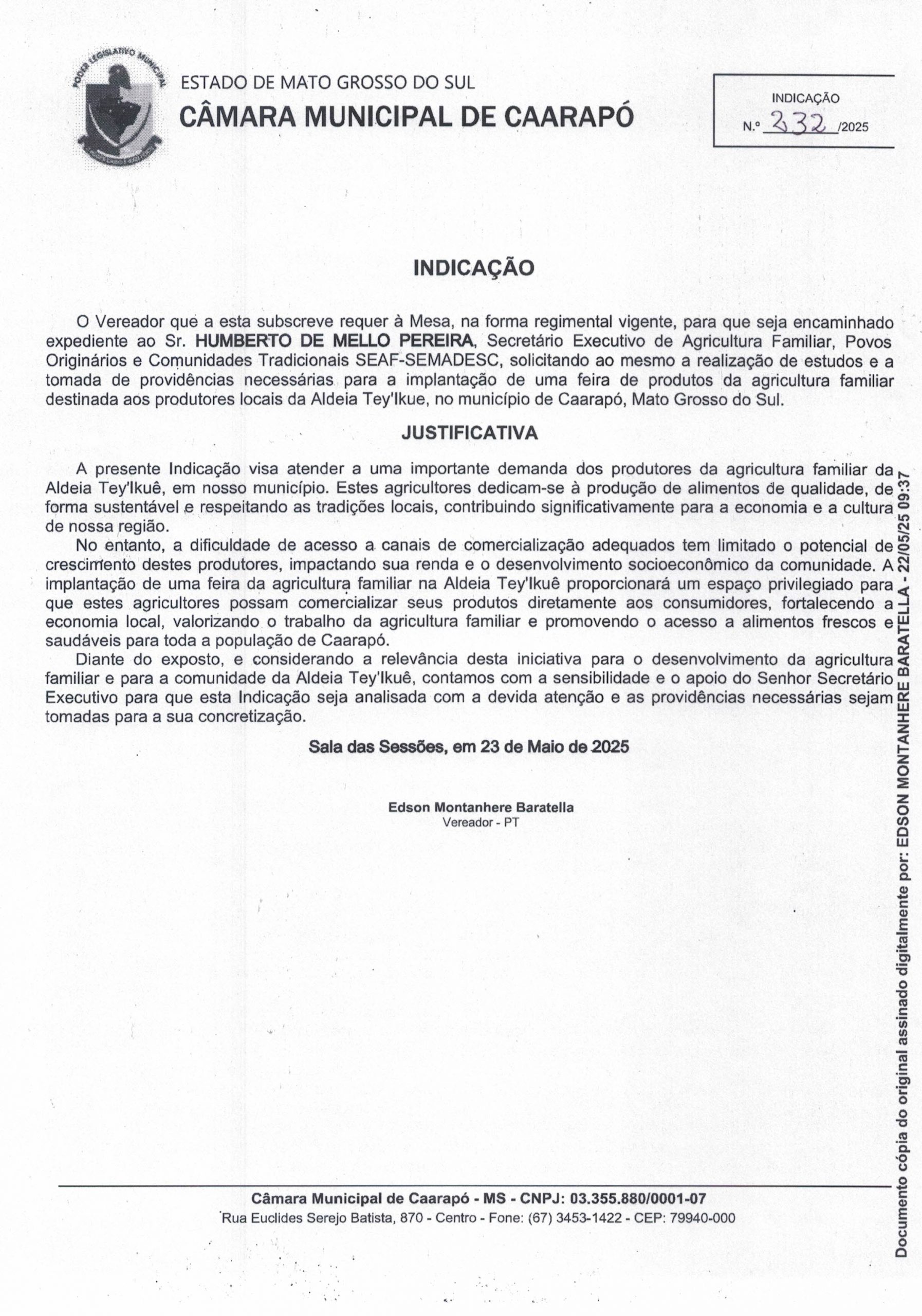 Indicação 232/2025, de autoria do Vereador EDSON MONTANHERE BARATELLA solicitando ao Sr. HUMBERTO DE MELLO PEREIRA, Secretário Executivo de Agricultura Familiar, Povos Originários e Comunidades Tradicionais SEAF-SEMADESC, a realização de estudos e a tomada de providências necessárias para a implantação de uma feira de produtos da agricultura familiar destinada aos produtores locais da Aldeia Tey’Ikue, no município de Caarapó, Mato Grosso do Sul.
