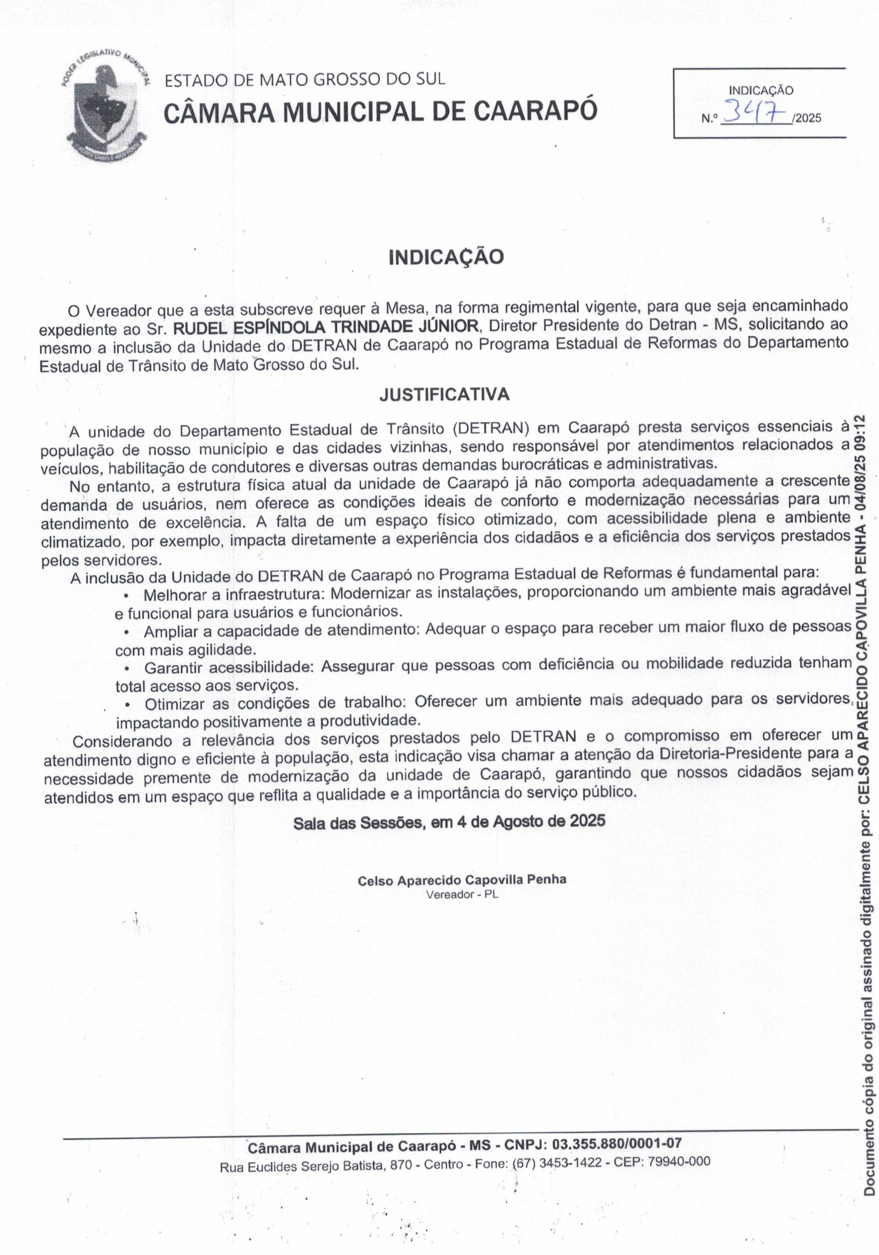 Indicação 347/2025, de autoria do Vereador CELSO APARECIDO CAPOVILLA PENHA solicitando ao Sr. RUDEL ESPÍNDOLA TRINDADE JÚNIOR, Diretor Presidente do Detran – MS, a inclusão da Unidade do DETRAN de Caarapó no Programa Estadual de Reformas do Departamento Estadual de Trânsito de Mato Grosso do Sul.