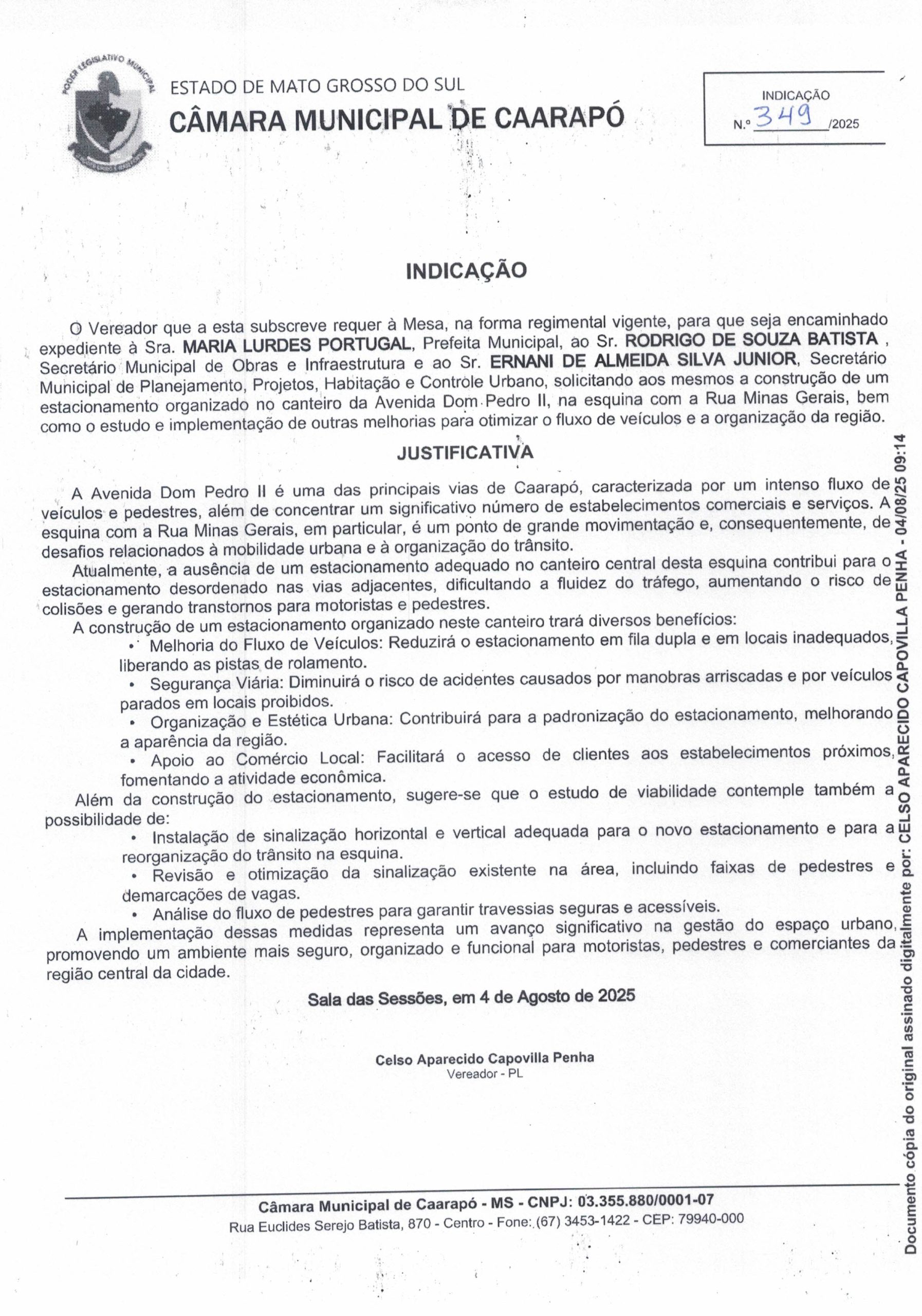 Indicação 349/2025, de autoria do Vereador CELSO APARECIDO CAPOVILLA PENHA solicitando à Sra. MARIA LURDES PORTUGAL, Prefeita Municipal, ao Sr. RODRIGO DE SOUZA BATISTA , Secretário Municipal de Obras e Infraestrutura e ao Sr. ERNANI DE ALMEIDA SILVA JUNIOR, Secretário Municipal de Planejamento, Projetos, Habitação e Controle Urbano, a construção de um estacionamento organizado no canteiro da Avenida Dom Pedro II, na esquina com a Rua Minas Gerais, bem como o estudo e implementação de outras melhorias para otimizar o fluxo de veículos e a organização da região.