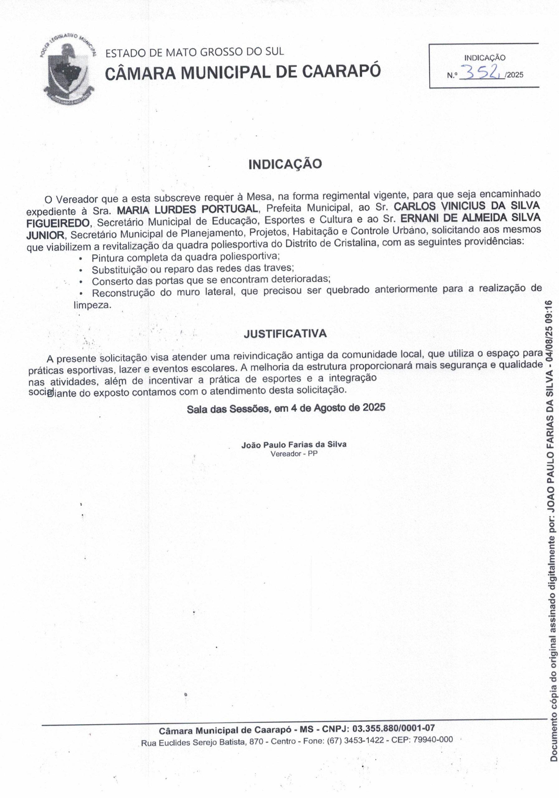 Indicação 352/2025, de autoria do Vereador JOÃO PAULO FARIAS DA SILVA solicitando à Sra. MARIA LURDES PORTUGAL, Prefeita Municipal, ao Sr. CARLOS VINICIUS DA SILVA FIGUEIREDO, Secretário Municipal de Educação, Esportes e Cultura e ao Sr. ERNANI DE ALMEIDA SILVA JUNIOR, Secretário Municipal de Planejamento, Projetos, Habitação e Controle Urbano, que viabilizema revitalização da quadra poliesportiva do Distrito de Cristalina, com as seguintes providências:
