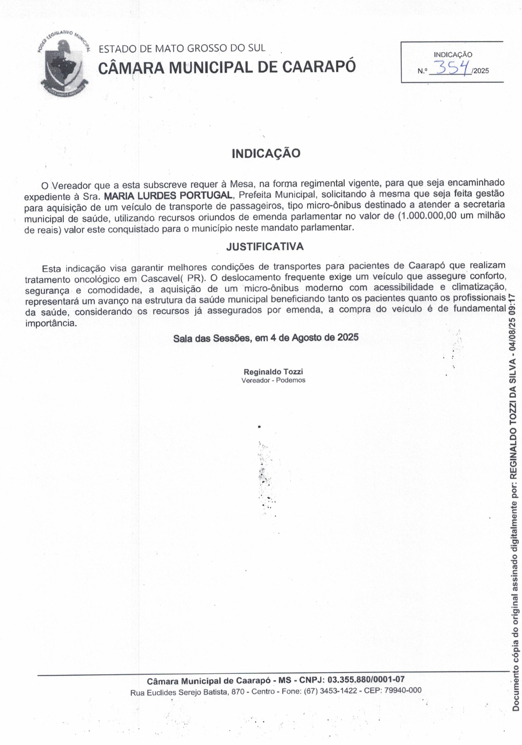 Indicação 354/2025, de autoria do Vereador REGINALDO TOZZI solicitando à Sra. MARIA LURDES PORTUGAL, Prefeita Municipal, que seja feita gestão para aquisição de um veículo de transporte de passageiros, tipo micro-ônibus destinado a atender a secretaria municipal de saúde, utilizando recursos oriundos de emenda parlamentar no valor de (1.000.000,00 um milhão de reais) valor este conquistado para o município neste mandato parlamentar.