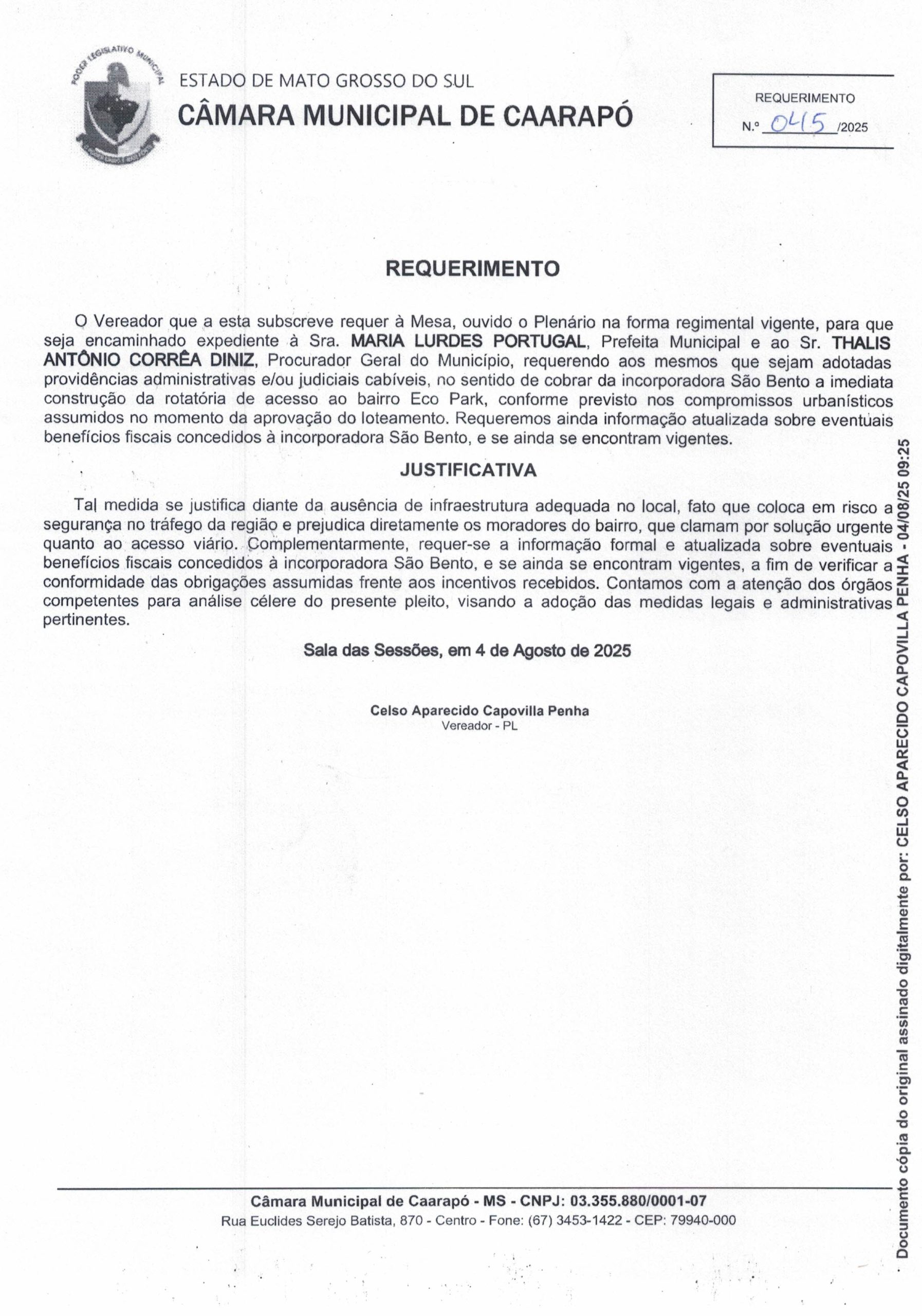 Requerimento 045/2025, de autoria do Vereador CELSO APARECIDO CAPOVILLA PENHA requerendo à Sra. MARIA LURDES PORTUGAL, Prefeita Municipal e ao Sr. THALIS ANTÔNIO CORRÊA DINIZ, Procurador Geral do Município, que sejam adotadas providências administrativas e/ou judiciais cabíveis, no sentido de cobrar da incorporadora São Bento a imediata construção da rotatória de acesso ao bairro Eco Park, conforme previsto nos compromissos urbanísticos assumidos no momento da aprovação do loteamento. Requeremos ainda informação atualizada sobre eventuais benefícios fiscais concedidos à incorporadora São Bento, e se ainda se encontram vigentes.