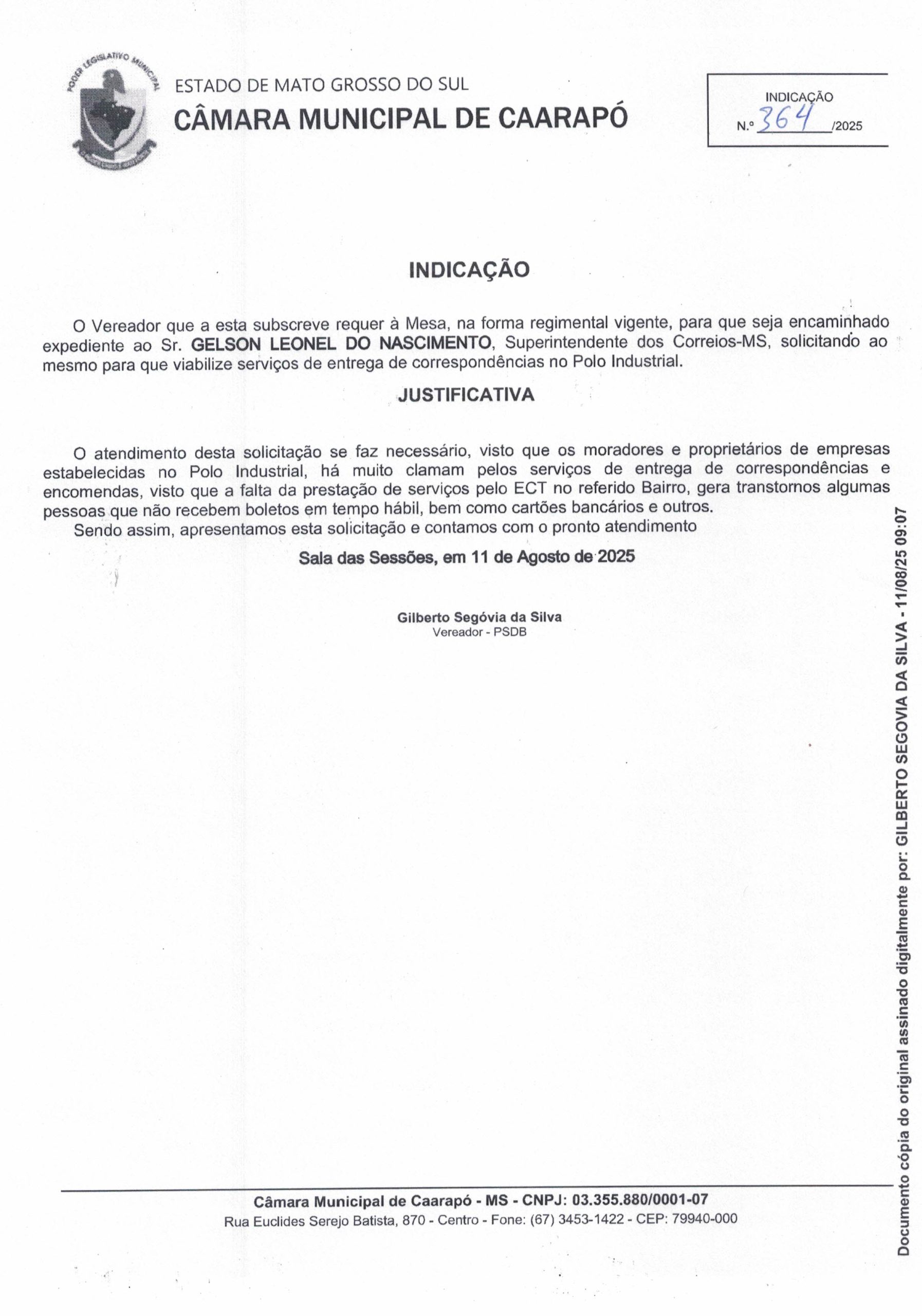 Atividade LegislativaIndicações Indicação 364/2025, de autoria do Vereador GILBERTO SEGÓVIA DA SILVA Por Jorge Barreiros 08:44 - 22/08/2025 53 - Publicidade - Compartilhe! Indicação 364/2025, de autoria do Vereador GILBERTO SEGÓVIA DA SILVA solicitando ao Sr. GELSON LEONEL DO NASCIMENTO, Superintendente dos Correios-MS, para que viabilize serviços de entrega de correspondências no Polo Industrial. 364Baixar Share FacebookTwitterPinterestWhatsApp Leia também Requerimento 066/2025, de autoria do Vereador CELSO APARECIDO CAPOVILLA PENHA 09:46 - 05/11/2025 Moção de Repúdio 001/2025, de autoria da Vereadora MARINALVA DE SOUZA FARIAS DA COSTA 09:42 - 05/11/2025 Moção de Aplausos 021/2025, de autoria do Vereador EDSON MONTANHERE BARATELLA 09:42 - 05/11/2025 Indicação 533/2025, de autoria do Vereador LEANDRO DAS VÍRGENS 09:41 - 05/11/2025 Indicação 532/2025, de autoria do Vereador LEANDRO DAS VÍRGENS 09:37 - 05/11/2025 Indicação 531/2025, de autoria do Vereador FLÁVIO AUGUSTO BATISTA DE SOUZA 09:33 - 05/11/2025 Indicação 530/2025, de autoria do Vereador MOACIR BARATELLI 09:32 - 05/11/2025 Indicação 529/2025, de autoria do Vereador MOACIR BARATELLI 09:27 - 05/11/2025 Indicação 528/2025, de autoria do Vereador MOACIR BARATELLI 09:25 - 05/11/2025 - Publicidade - Últimas Notícias Celso Capovilla apresenta emenda de R$ 5 milhões ao PPA e garante investimentos 13:37 - 05/11/2025 Nado tozzi atua para resolver problema causado por enxurrada vinda do polo industrial 10:20 - 05/11/2025 Vereador João Paulo do Dinho intensifica ações em prol dos distritos de Cristalina e Nova América 09:48 - 05/11/2025 Vereador Moacir Baratelli comemora sanção de Lei que garante Carteira de Identificação para pessoas com Fibromialgia em Caarapó 11:14 - 03/11/2025 Vereadora Marinalva de Souza Farias da Costa solicita nomeação urgente de Peritos Médicos Federais para o INSS de Caarapó 09:48 - 03/11/2025 - Publicidade - - Publicidade-