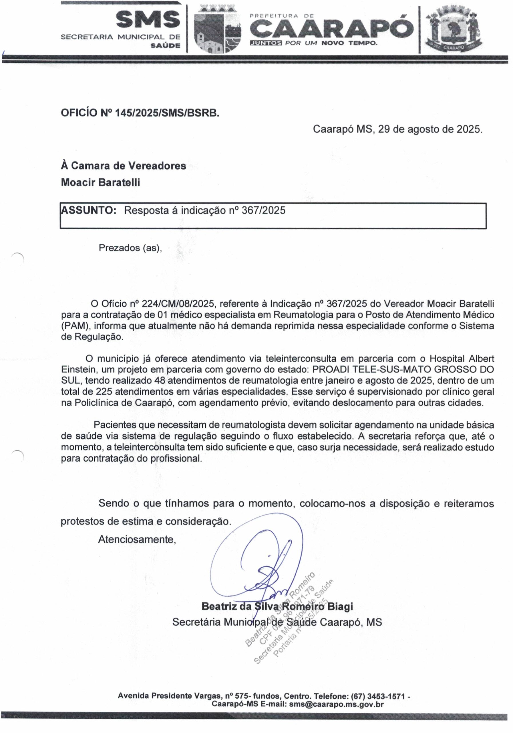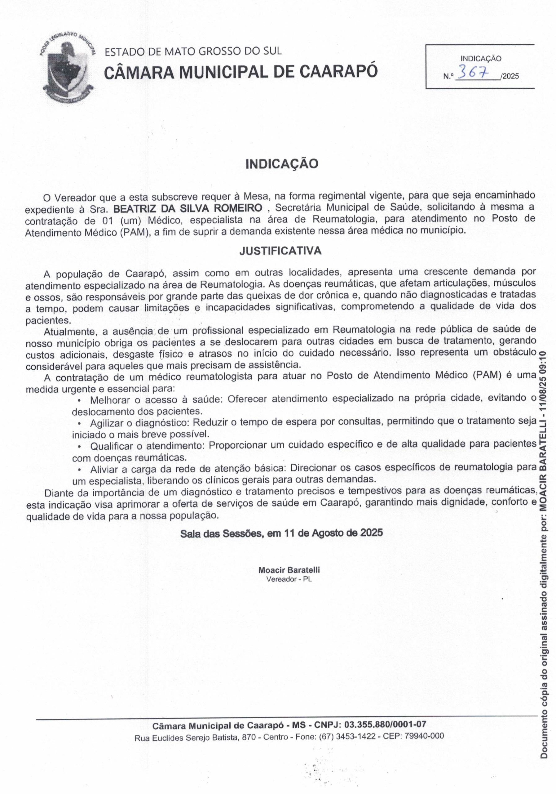 Indicação 367/2025, de autoria do Vereador MOACIR BARATELLI solicitando à Sra. BEATRIZ DA SILVA ROMEIRO , Secretária Municipal de Saúde, a contratação de 01 (um) Médico, especialista na área de Reumatologia, para atendimento no Posto de Atendimento Médico (PAM), a fim de suprir a demanda existente nessa área médica no município.