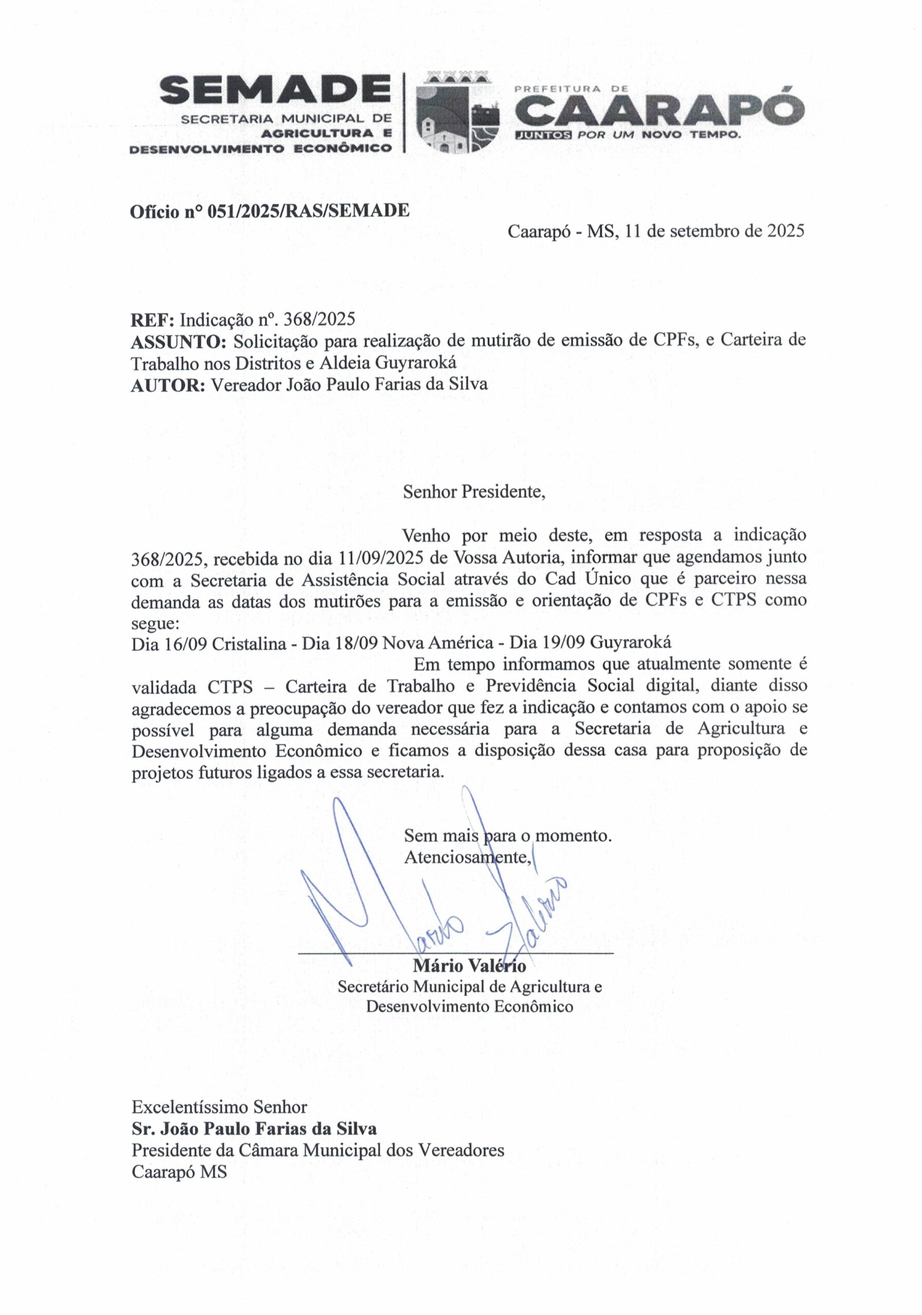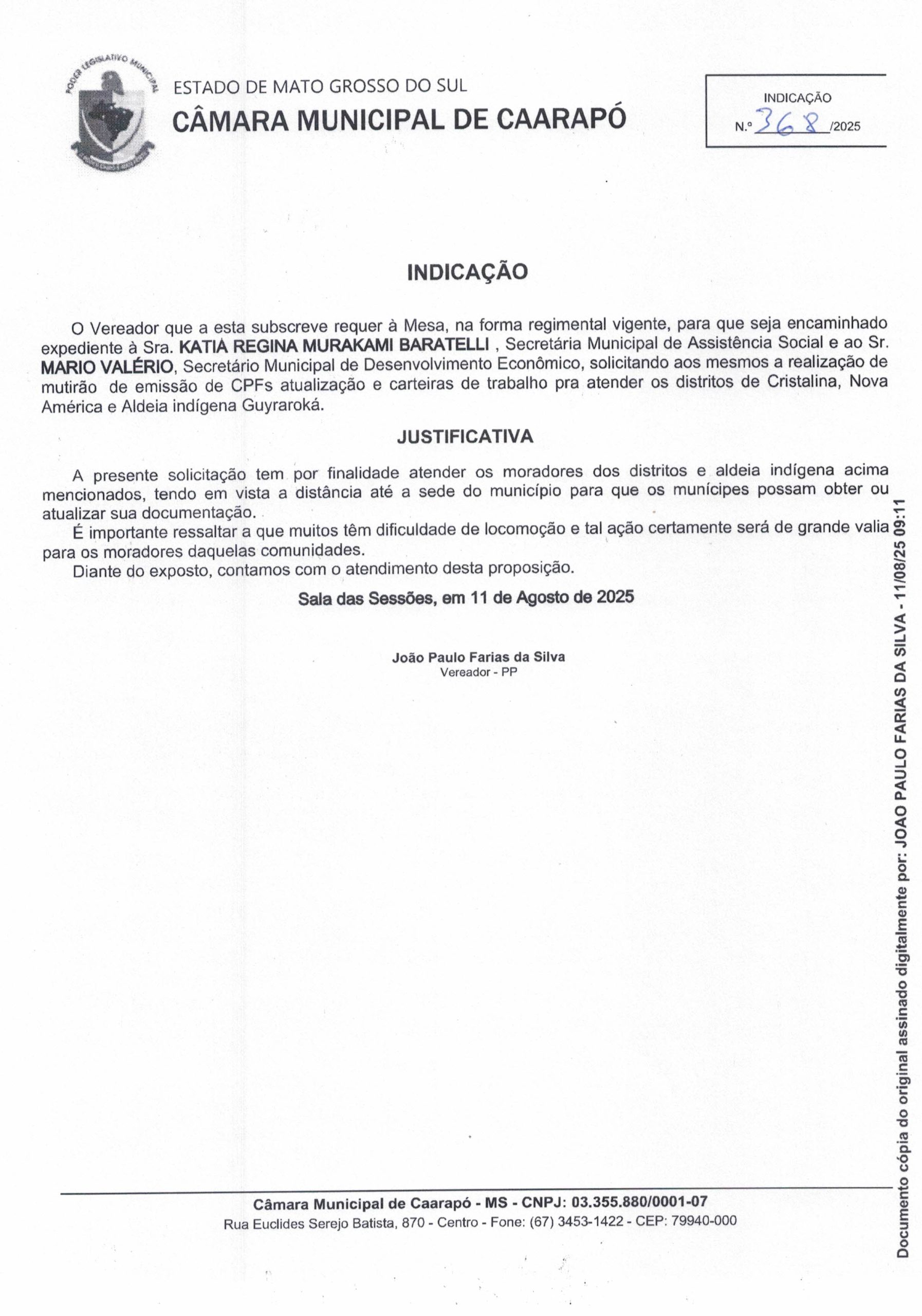 Indicação 368/2025, de autoria do Vereador JOÃO PAULO FARIAS DA SILVA solicitando à Sra. KATIA REGINA MURAKAMI BARATELLI , Secretária Municipal de Assistência Social e ao Sr. MARIO VALÉRIO, Secretário Municipal de Desenvolvimento Econômico, a realização de mutirão de emissão de CPFs atualização e carteiras de trabalho pra atender os distritos de Cristalina, Nova América e Aldeia indígena Guyraroká.