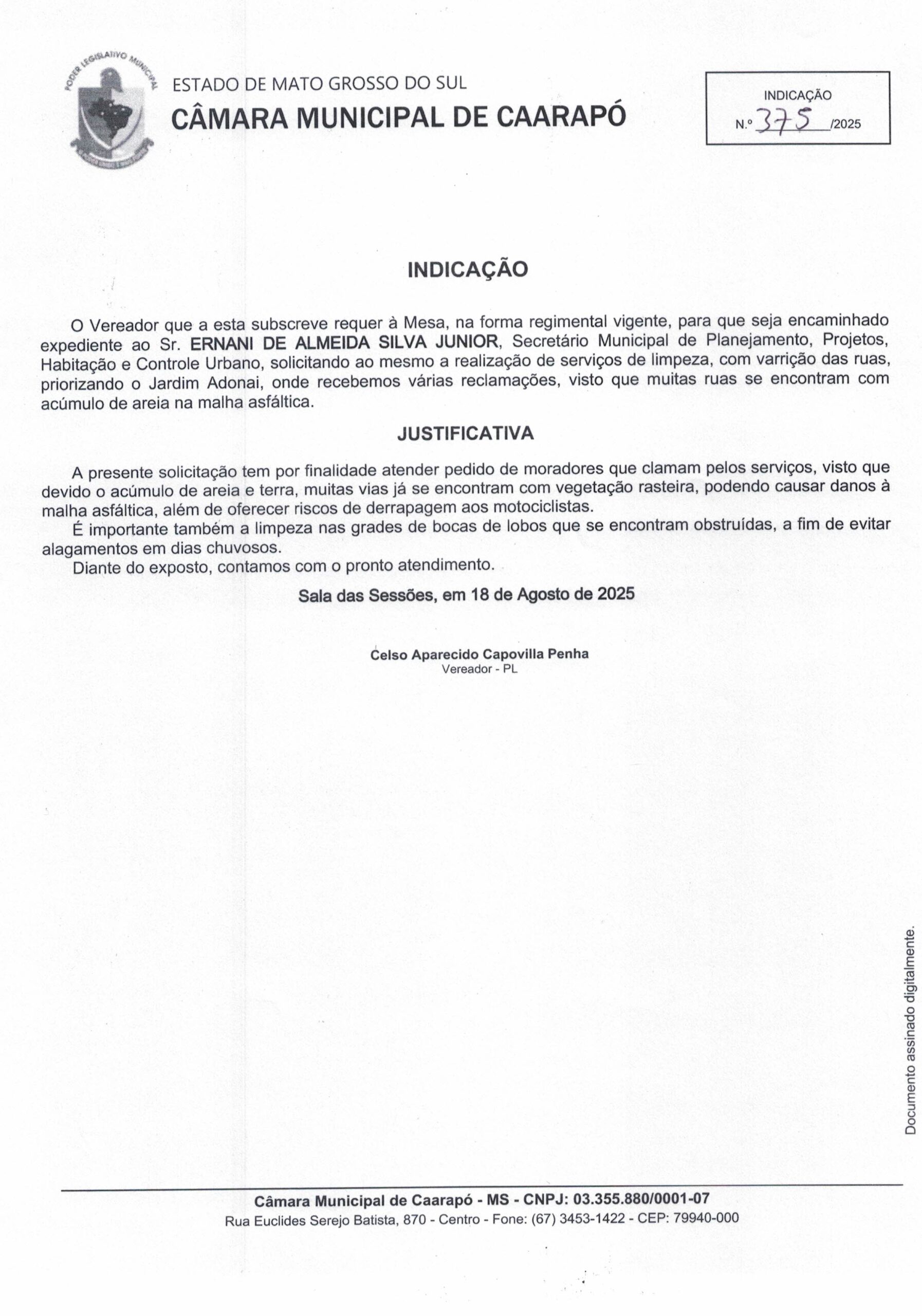 Indicação 375/2025, de autoria do Vereador CELSO APARECIDO CAPOVILLA PENHA solicitando ao Sr. ERNANI DE ALMEIDA SILVA JUNIOR, Secretário Municipal de Planejamento, Projetos, Habitação e Controle Urbano, a realização de serviços de limpeza, com varrição das ruas, priorizando o Jardim Adonai, onde recebemos várias reclamações, visto que muitas ruas se encontram com acúmulo de areia na malha asfáltica.