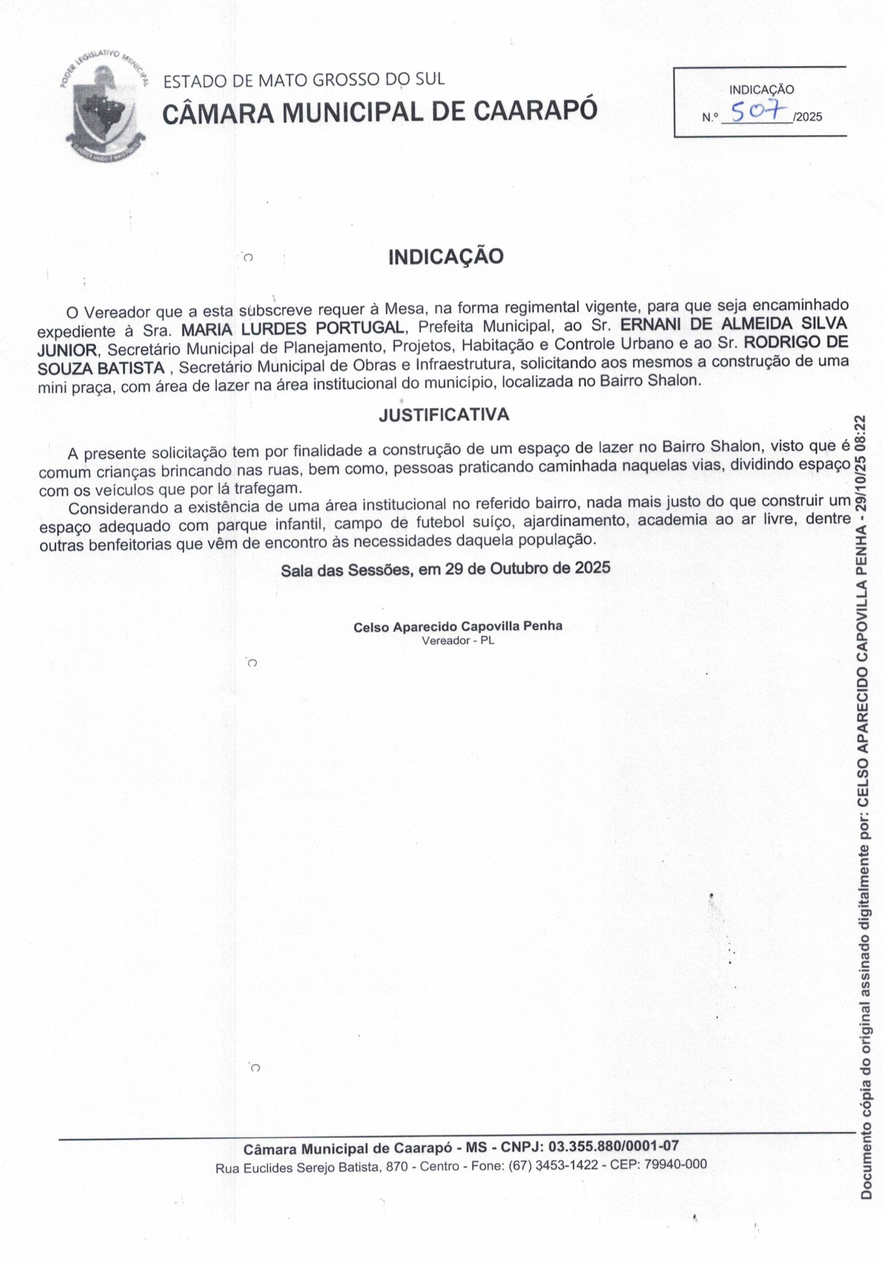 Indicação 507/2025, de autoria do Vereador CELSO APARECIDO CAPOVILLA PENHA solicitando à Sra. MARIA LURDES PORTUGAL, Prefeita Municipal, ao Sr. ERNANI DE ALMEIDA SILVA JUNIOR, Secretário Municipal de Planejamento, Projetos, Habitação e Controle Urbano e ao Sr. RODRIGO DE SOUZA BATISTA , Secretário Municipal de Obras e Infraestrutura, a construção de uma mini praça, com área de lazer na área institucional do município, localizada no Bairro Shalon.